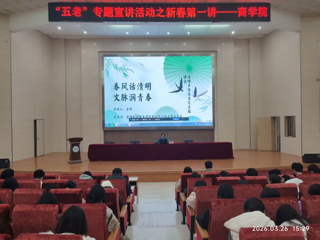 为弘扬中华优秀传统文化,深化青年学生爱国主义教育,3月26日,商学院联合学校关工委在二号报告厅举办“五老”专题宣讲活动之新春第一讲。活动特邀学校原副校长、关工委常务副主任李伶教授作...