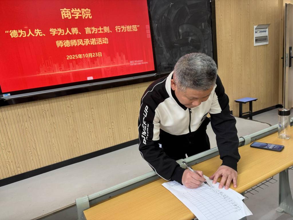 商学院党总支书记王建宏带领全体教师郑重承诺,要将《高校教师职业道德规范》融入心中,体现于日常行为,争做“四有”好老师。