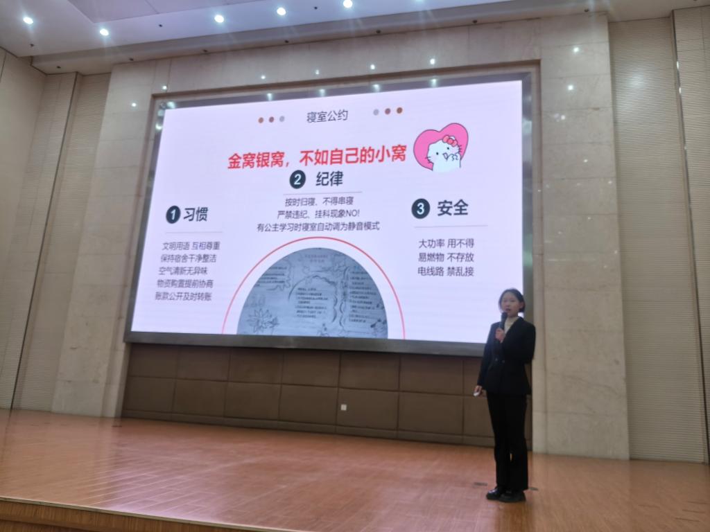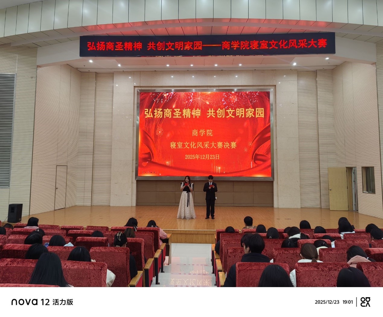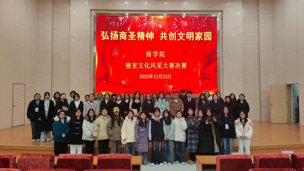 为传承商圣范蠡诚信务实、协作共赢的精神内核,营造文明和谐的校园文化氛围,12月23日晚,商学院在图书馆二号报告厅开展以“弘扬商圣精神,共创文明家园”为主题的寝室文化风采大赛。商学院学工科科长房莹,辅导员仝宝珍、杨平及2025级全体学生参加本次活动。