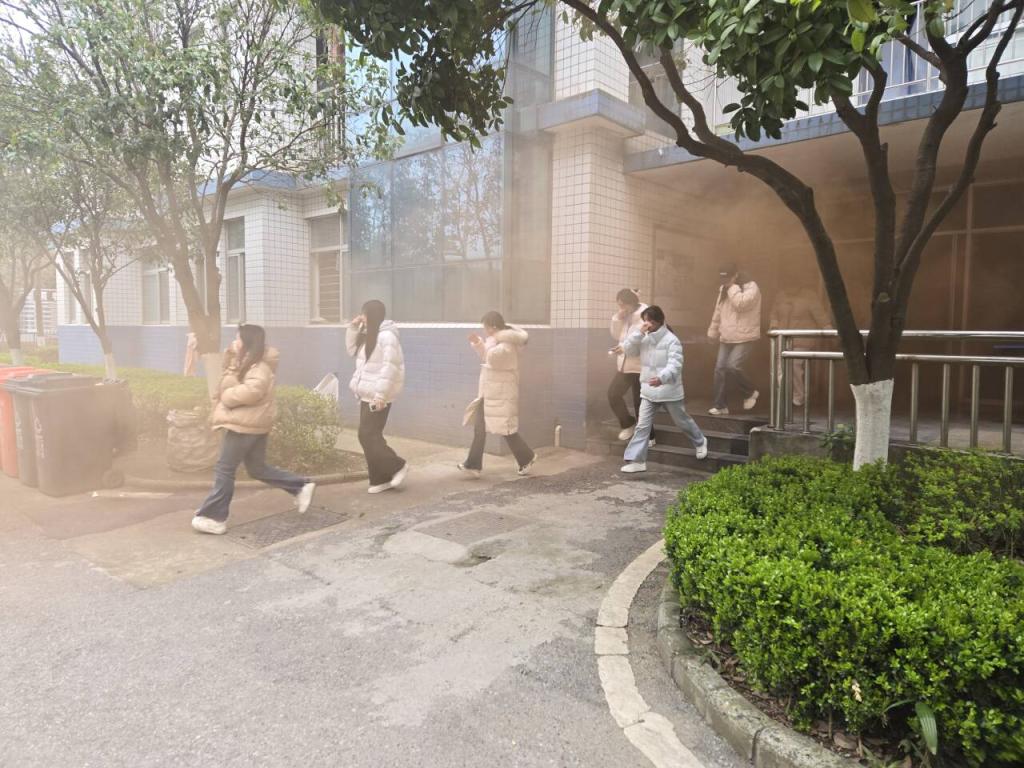 随着模拟演练警报响起,各楼层学生迅速行动,用湿毛巾捂住口鼻,沿指定疏散通道有序撤离至楼外安全区域。演练结束后,梁光源在总结中强调,希望同学们以练促防,牢记逃生要领,熟练避险技能,真正将安全意识内化于心、外化于行。